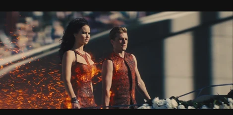 In the 75th Hunger Games, some of the other stylists had taken note of Katniss and Peeta's entrance the previous year, and copied the idea of illuminating their district's tributes. The notable outfits worn were: