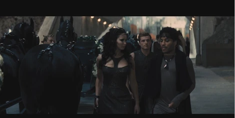 - Film: The tributes wore body suits with rows of silver and gold to represent fields of grain, and they wore silver half circles behind their head.