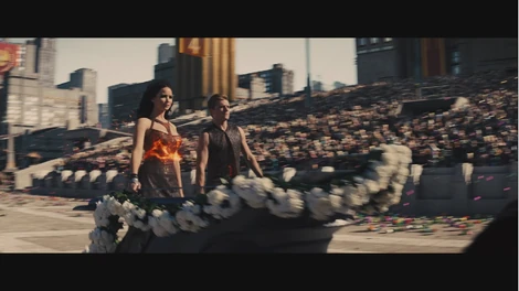 To show their approval, the audience would cheer for the tributes they liked, sometimes even throwing small objects in admiration (in her first parade, Katniss Everdeen caught a rose thrown by an audience member).[1] To make a good impression, most tributes would smile and wave and appear friendly, but other tactics could be employed: for the 75th Hunger Games, Katniss and Peeta were instructed to appear aloof and uncompromising, as if the entire event was beneath them; this also made quite an impression on the audience.